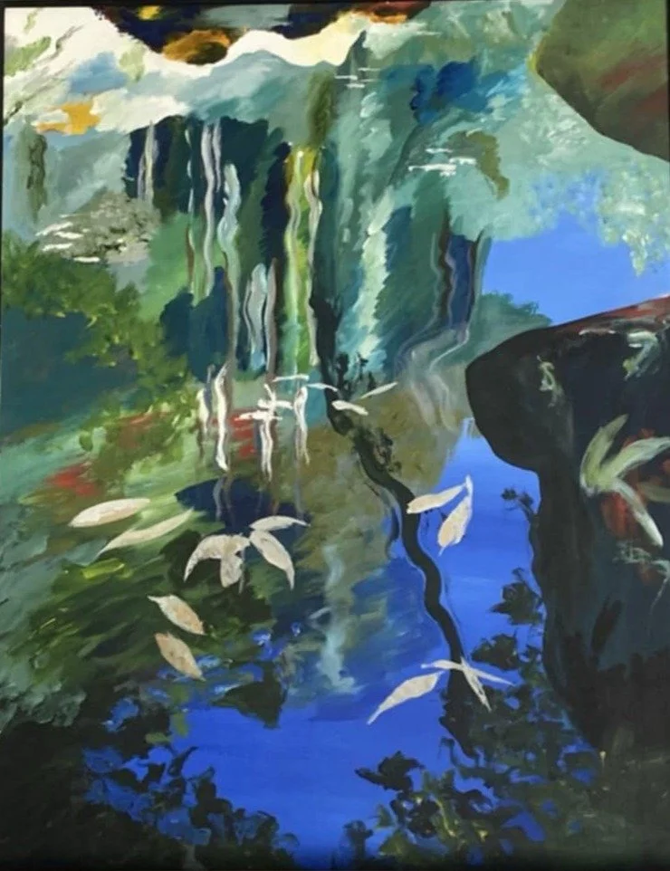 Translucent layers reflect the stained, mirrored waters of Shirley Creek—across the road from the home where Cheryl grew up. Those fragments of love, and place remain embedded in the very fibre of her work. These works honour the tea tree-stained creeks of Bribie Island — sites of reflection, distortion, and transformation. The dark water reveals a world inverted—rocks, leaves, and sky—blurring surface with depth.
